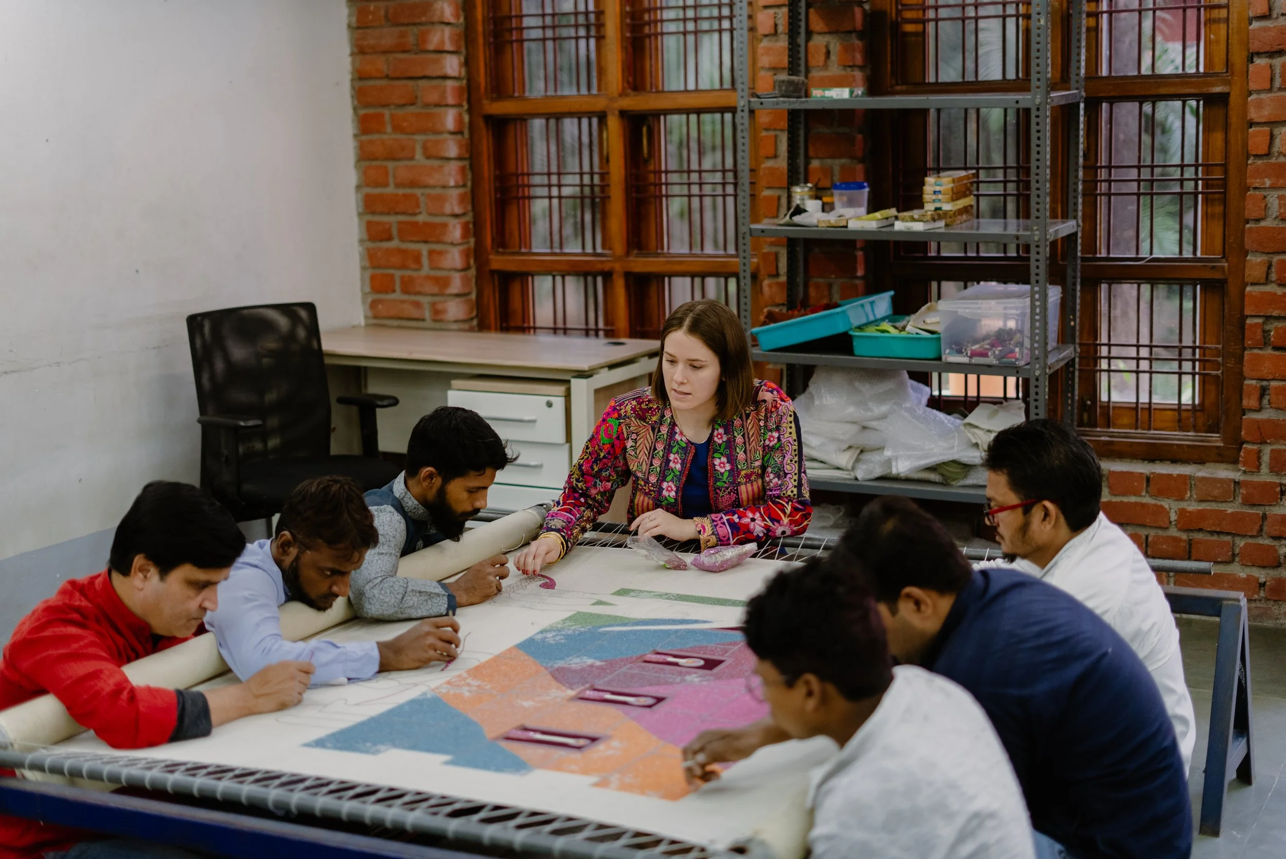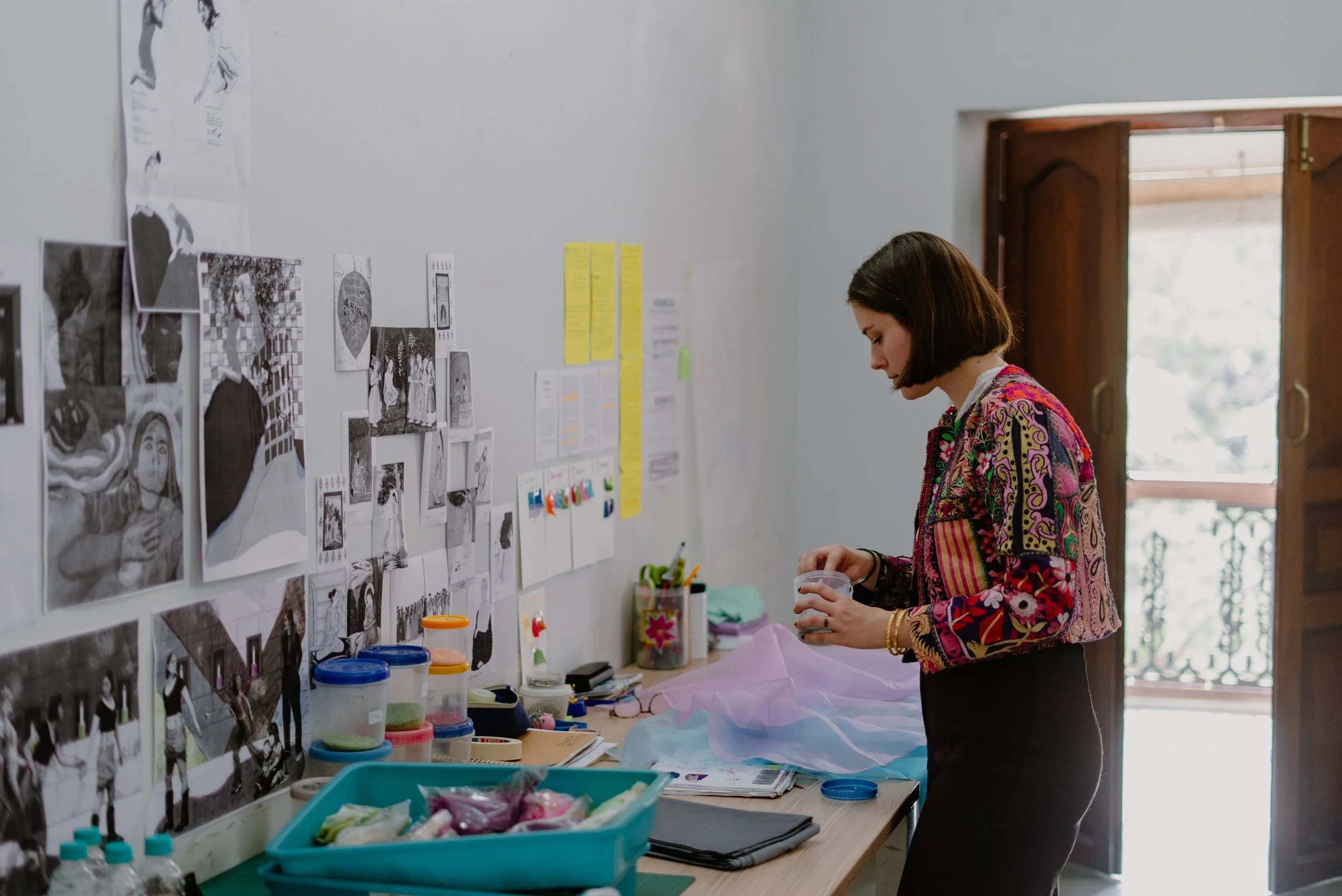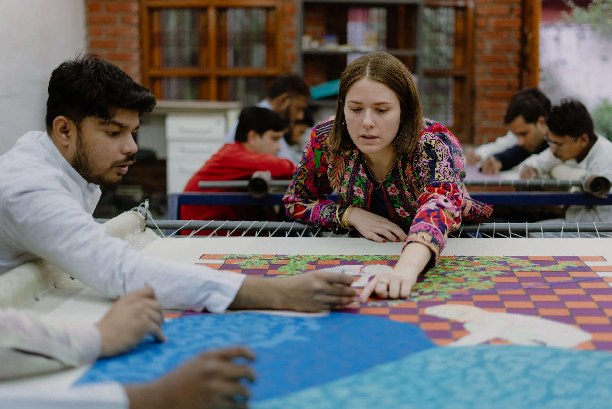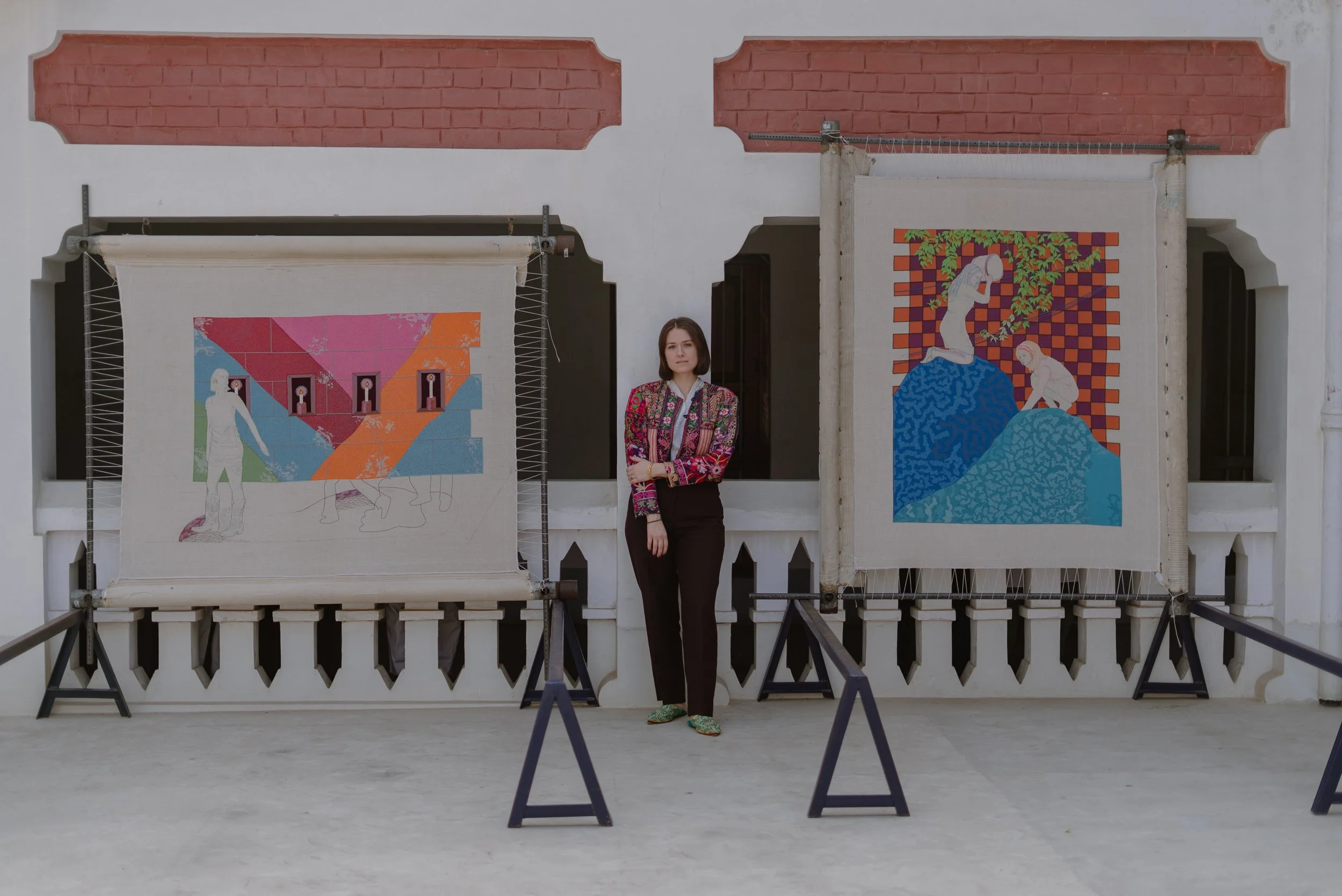 in India, India’s textile traditions offered an opportunity to learn and collaborate with Kalhath’s master artisans, further deepening my understanding of embroidery and transforming my approach to image-making. The body of work I made during this residency reflects on personal narratives of spiritual and physical journeys, inspired by the architectural details and vibrant colors of Lucknow. It also explores the complex feelings of being a woman in foreign space, while drawing on the warmth, spirituality, and cultural exchanges I experienced.