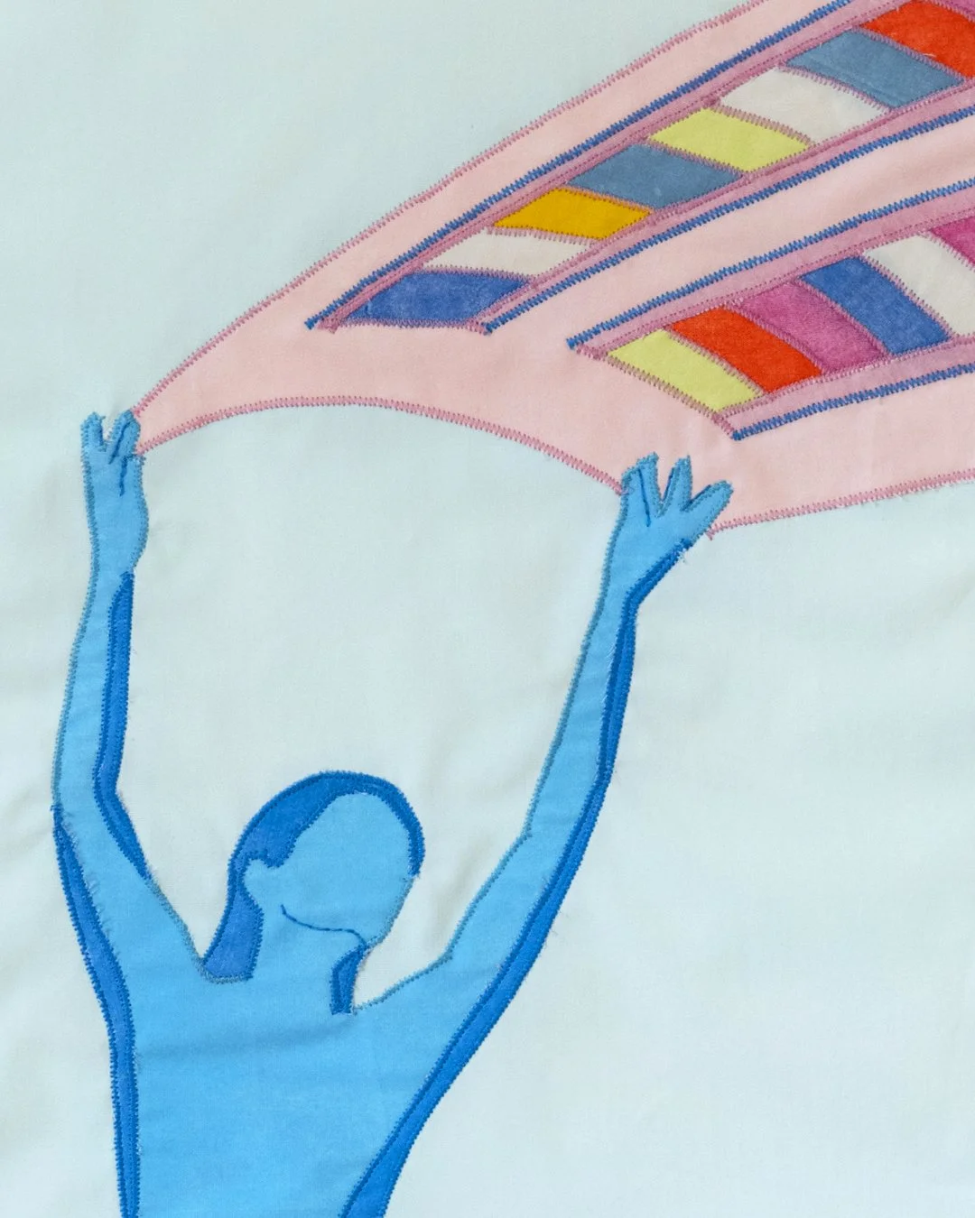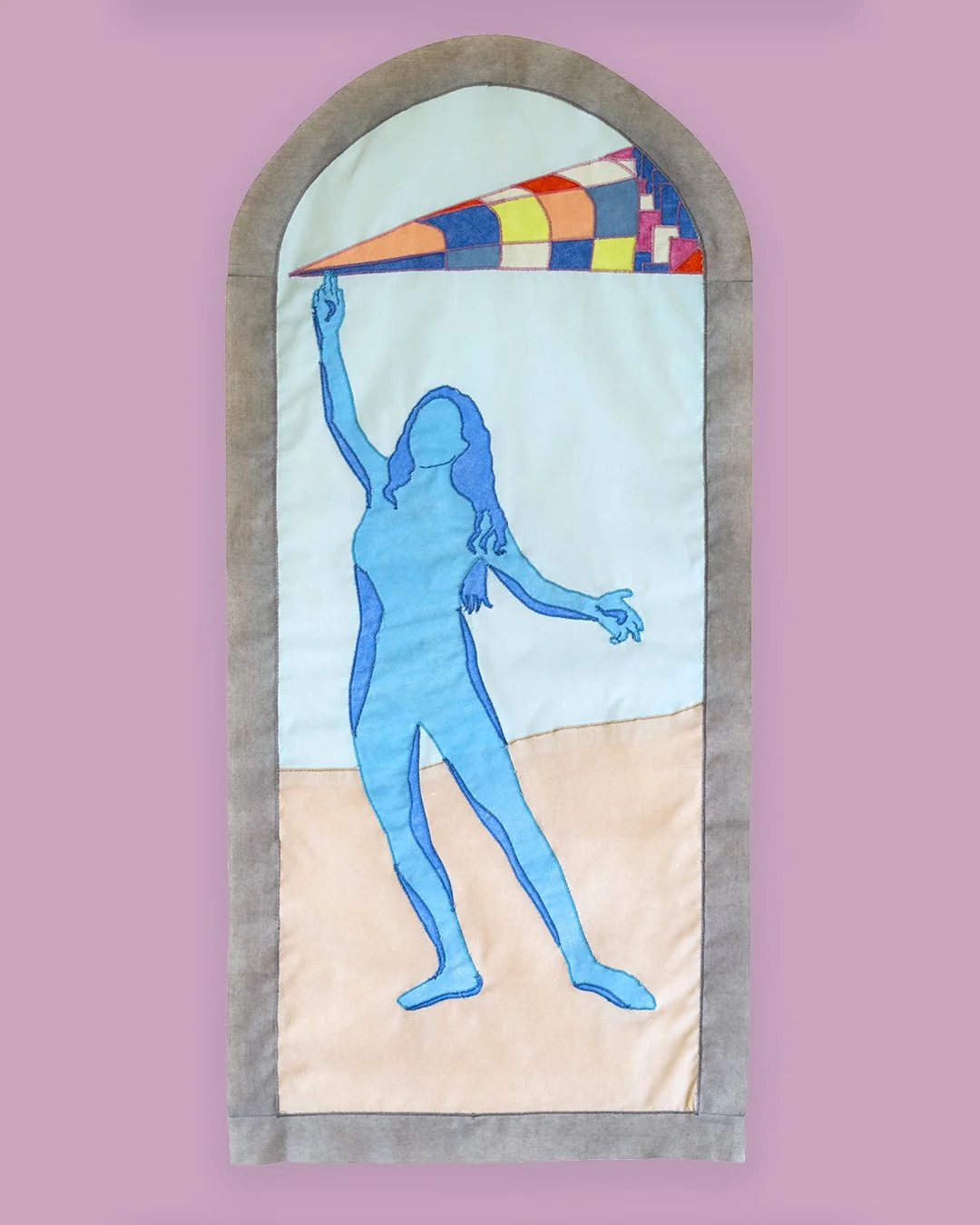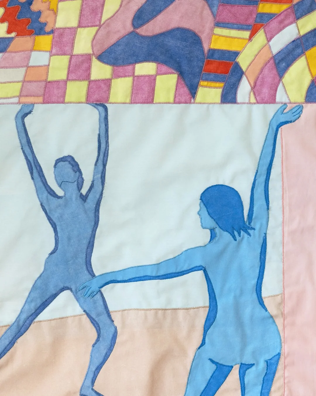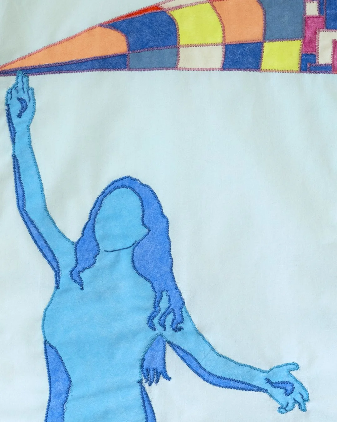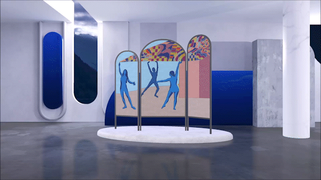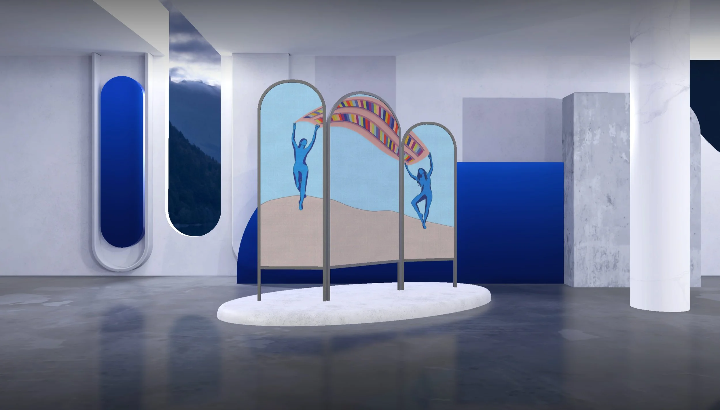 “Colonnade of Craft” exists as both a virtual piece, a digital paravant, as well as a physical piece of fabric panels. A paravent embraces both craft and art, much like the Bauhaus principles. In participation with The Women Bauhuas Collective by La Prairie, this 6 month long project is not only an homage to the women of the Bauhaus weaving workshop, but also a celebration to the collective creativity produced within our own collective. For the physical version of Colonnade of Craft, the fabric panels are formed by using a mix of monotype printing and sewing techniques in order to create and assemble the fabric. The virtual piece can be seen here, in the Pursuit of Harmony virtual exhibition.